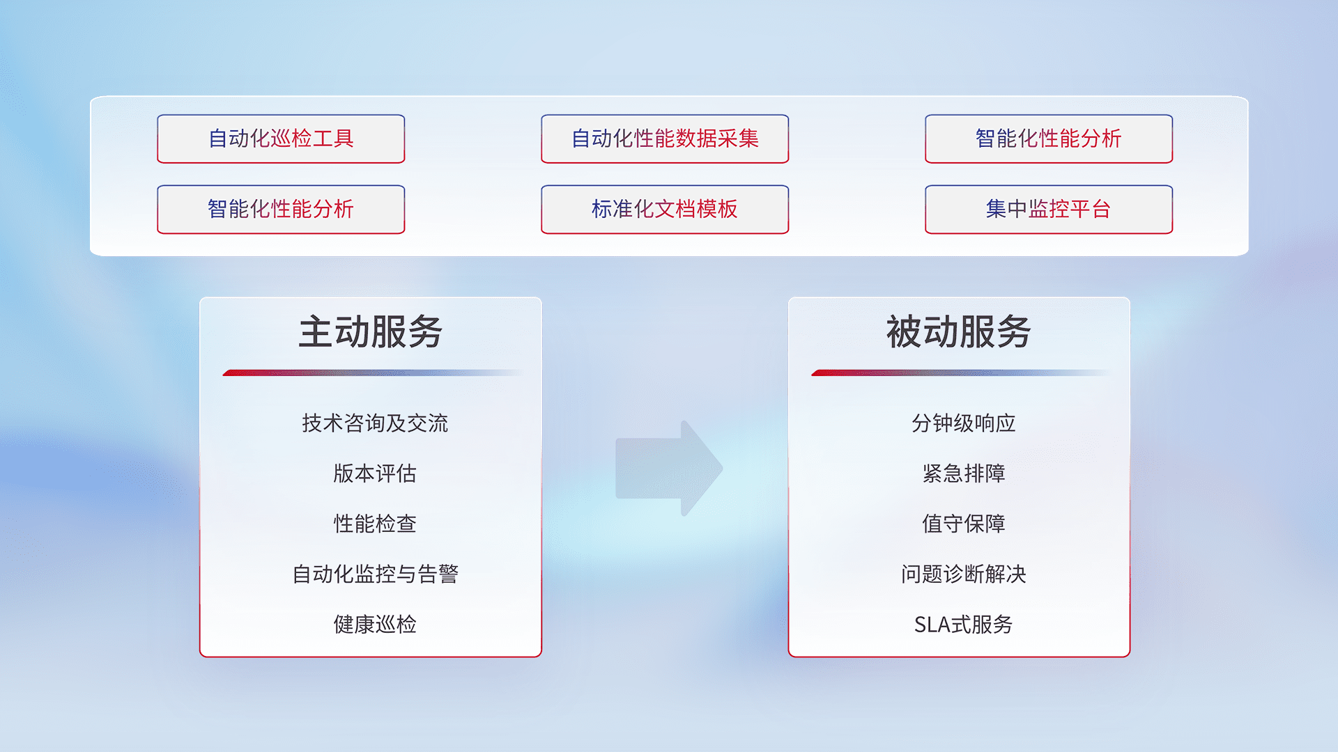 智能化工具和标准化文档,,,保障服务质量,,,提供主动服务(包含技术咨询、、、版本评估、、、性能检查、、自动化监控与告警、、、健康巡检)和被动服务包含(分钟级响应、、、紧急排障、、值守保障、、、问题诊断解决、、、、SLA服务)。。。。